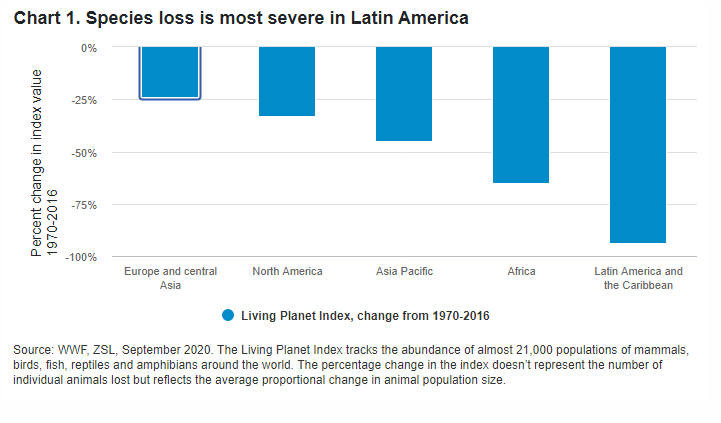 Biodiversity is being lost at an alarming rate around the world, but most severely in Latin America due to deforestation and climate change. The abundance of species in Latin America and the Caribbean has fallen by 94 per cent since 1970 (see chart 1). Unless companies monitor and preserve biodiversity directly, the situation will only get worse.