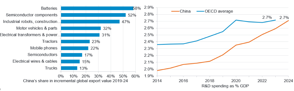 China is gaining share in fast-growing export segments, backed by R&D spending