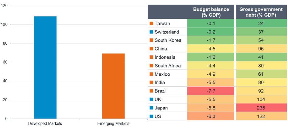 Source: LHS: Fidelity International, LSEG Datastream, IMF Fiscal Monitor, as of October 2024. RHS: JP Morgan, 2026 Outlook, Emerging Markets Equity Strategy, 2 December 2025.