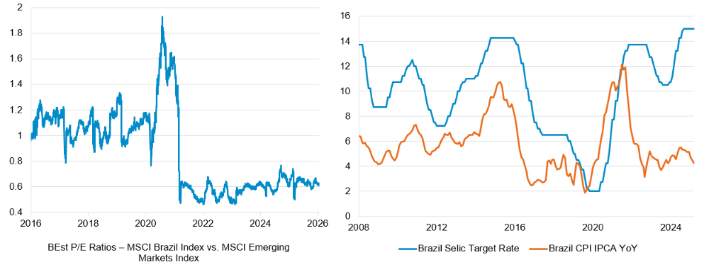 Brazil is trading at a record discount (LHS), but an easing cycle could trigger re-rating (RHS)