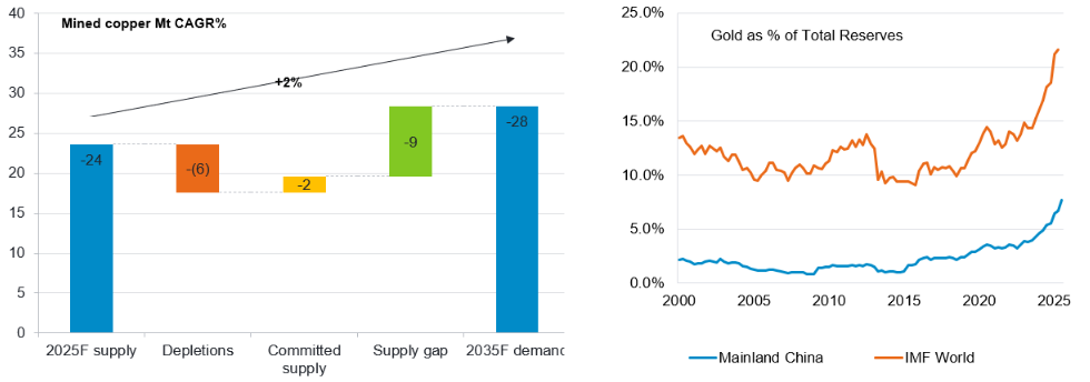 Source: LHS: Rio Tinto Capital Markets Day, 4 December 2025. RHS: Fidelity International, Respective Central Banks, World Gold Council, as of 30 September 2025.