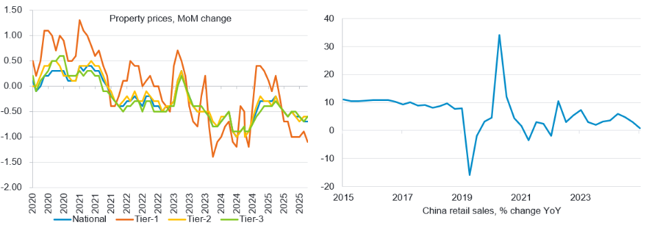 Finally, China warrants separate consideration given its considerable weight in the EM index. Here, the backdrop is complex, with the outlook for the consumer remaining challenged. Although we have seen the government shift towards expansionary policy, with rate cuts and targeted consumer stimulus packages aiming to support consumption, stimulus such as last year’s trade-in subsidies are now coming to an end, and the property market remains weak. House price growth continues to be in negative territory, and whilst excessive inventory levels within the market have stabilised, they have not yet fallen. Given that historically ~60% of household wealth in China has been tied up in the property market, it seems unlikely we will see a consumer recovery until the property market recovers.