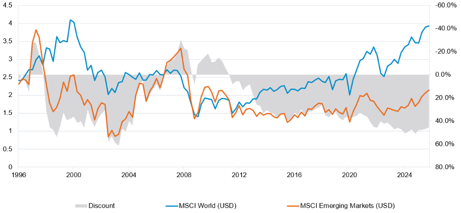 However, 2025 saw several of these factors beginning to shift, with a weaker US dollar, falling interest rates, momentum in certain key commodities such as copper and gold, and signs of recovery in parts of the Chinese market supporting the asset class. Also supportive was the presence of a growing base of investors starting to look beyond the US for alternatives. And with the asset class still trading at a ~40% discount versus the rest of the world, there could be scope for continued re-rating in the market this year.