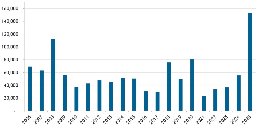 As such, AI related issuance with an attractive enough new issue concession and sound underlying credit fundamentals remains an area we are willing to participate in. Given the credit quality of these issuers, it is also less likely the bonds will underperform more highly leveraged investment grade sectors in a risk-off move. Where we would exercise more caution, however, is if issuance were to start growing significantly from more speculative areas of the AI linked tech sector, where capex is based on future cashflow expectations rather than supported by strong current cashflow.