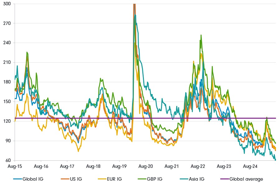 Source: Fidelity International, Bloomberg, September 2025. Indices used are G0BC, C0A0, UR00, ER00 and ADIG.