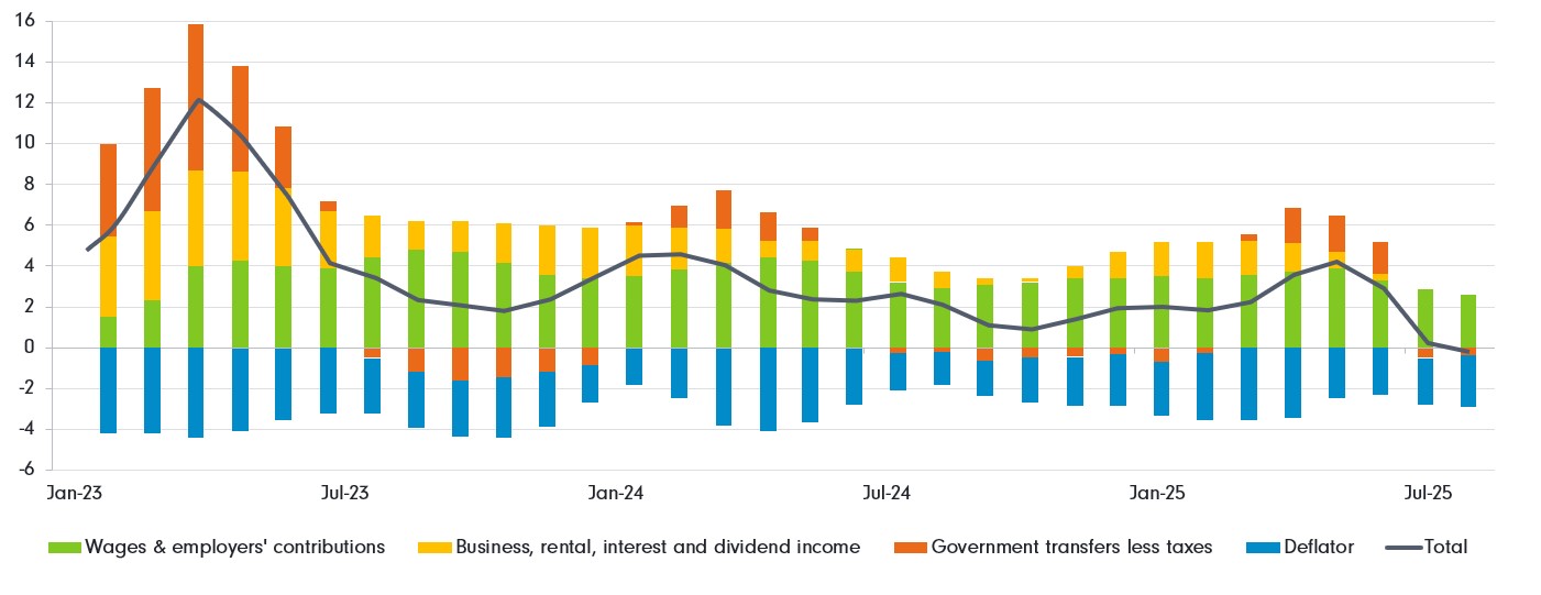 The pressure we have begun to see in the labour market, with a series of payroll prints falling below expectations and significant revisions to prior prints, will only exacerbate this burden on the consumer. Other evidence for this weakness in the labour market includes a marked fall in the monthly change in private-sector employment for firms employing fewer than 50 workers, and a downward trend in the rate of US workers leaving their jobs, highlighting that American worker confidence in finding new employment is low.