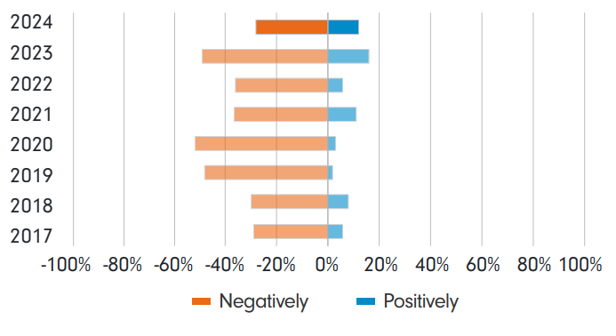 Chart shows responses to the question: ‘How, if at all, do you expect inflationary pressures within your companies’ cost bases to change over the next 12 months?’ Analysts who responded ‘No change’ are not shown on the chart. Source: Fidelity International, January 2024.