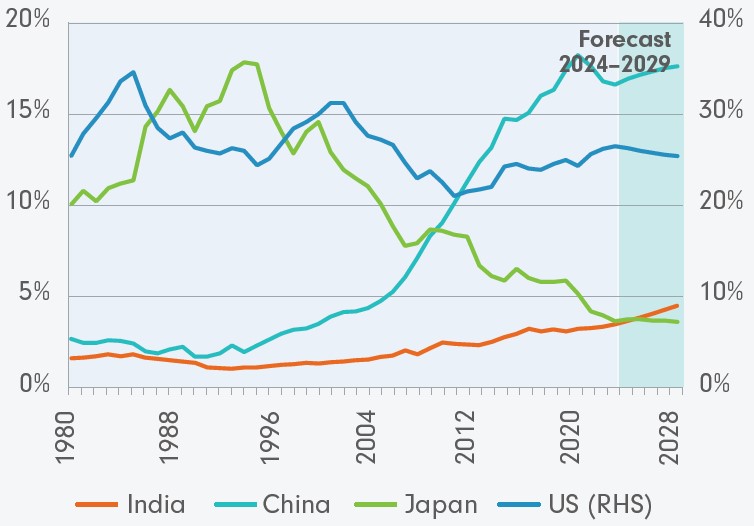 Figure 2. India’s share in world GDP is growing from a low base.