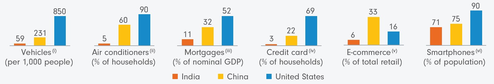 Sources: 3(a): Morgan Stanley BluePaper: Why this is India’s decade, 31 October 2022. In 2021, Number of Households was 295mn and GDP per capita was US$2,278. In 2031, Number of Households estimated to be 361mn and GDP per capita estimated to be US$5,242. 3(b): (i) Vehicles excluding 2-wheelers. CEIC, China Ministry of Public Security, Hedges & Company. Data for 2022. (ii) International Energy Agency. Data for 2018. (iii) EMF, Hofinet, HDFC estimates, Wind, China NBS, 2022. (iv), (v), (vi) Payments & ecommerce report, PPRO Financial, 2022.