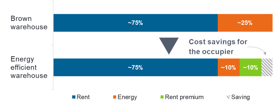 The economics of logistics buildings increasingly hinge on energy performance. In most facilities, rent accounts for roughly 75% of occupancy costs, while energy makes up much of the remainder. This means that even moderate improvements in efficiency and onsite power generation can meaningfully reduce the overall cost to the tenant. In many cases, total occupancy costs can fall even if rent rises to reflect the retrofit, this is what we call a “green premium”.