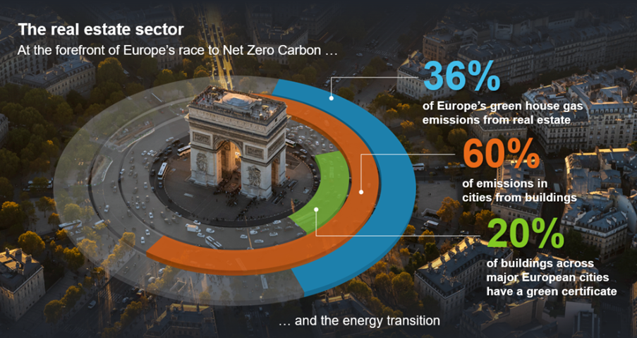 But underneath this headline story sits another one, much quieter but no less important. Many of the gains we need over the next decade will not only come from adding more clean energy supply, but also from using less energy in the first place and removing pressure from the grid bottleneck. And within that realm, energy efficiency in logistics assets in Europe stand out as they benefit from the perfect storm of rising energy prices, regulatory clarity, physical infrastructure constraints and the practical needs of occupiers. As illustrated below, real estate sits at the centre of Europe’s decarbonisation challenge.